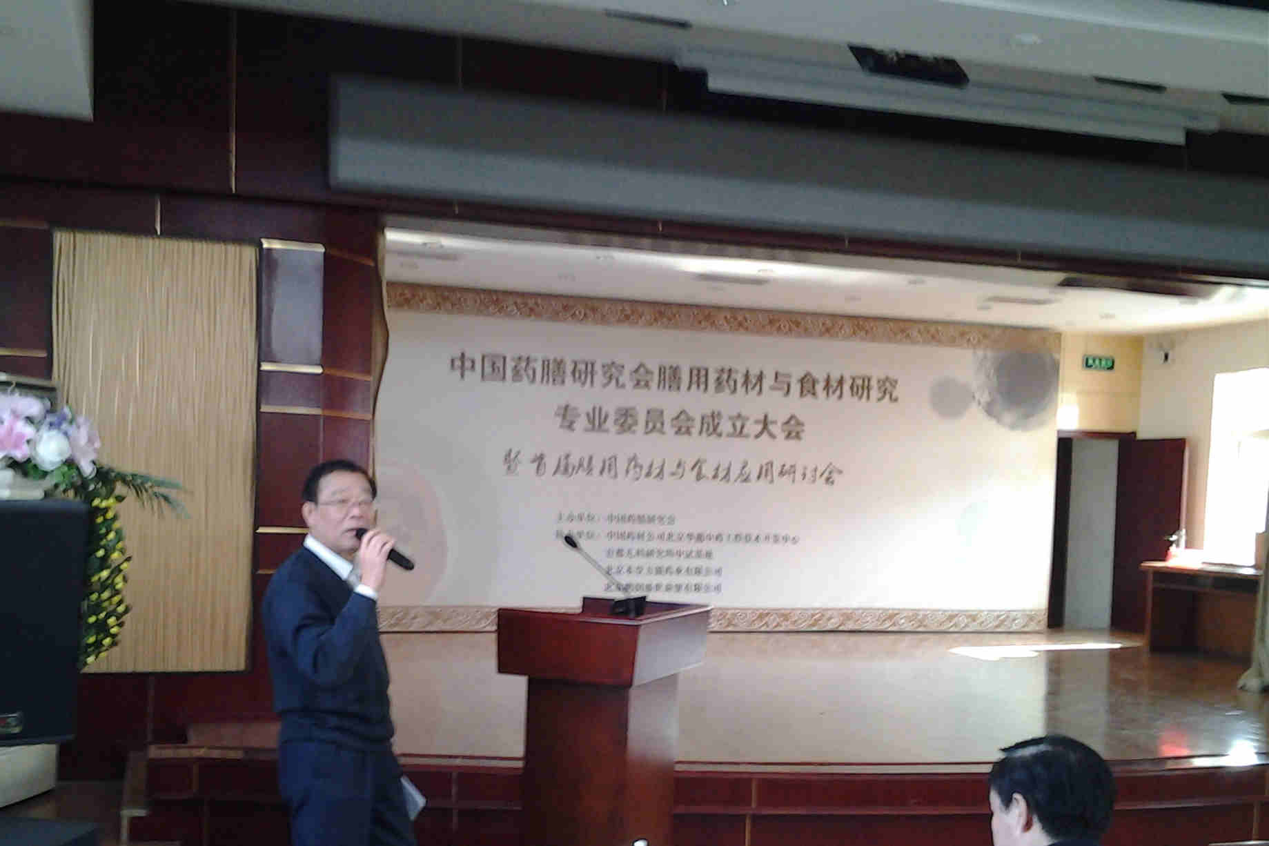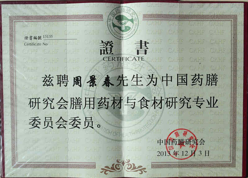 为了弘扬中国传统药膳文化,进一步研究膳用药材与食材的应用与发展,2013年12月22日,由中国药膳研究会举办的关于组建“膳用药材与食材研究专业委员会”成立大会暨首届药材与食材应用研讨会,在北京中国医学科学院药用植物研究所院内举行。特聘请我公司总裁周景春为中国药膳研究会膳用药材与食材研究专业委员会委员,并向我公司总裁颁发荣誉证书。