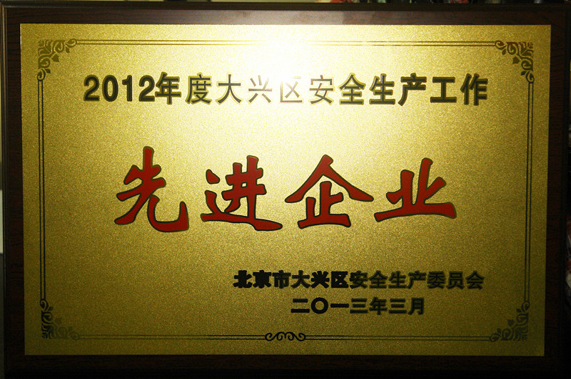 3月8日,我公司荣获北京市大兴区安全生产委员会颁发的“2012年度大兴区安全生产工作先进企业”荣誉称号。
